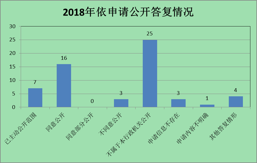 答复政府信息公开申请共59宗。其中,属已主动公开范围7宗,占11.9%;同意公开16宗,占27.2%;同意部分公开0宗,占0%;不同意公开3宗,占5%;不属于本行政机关公开25宗,占42.4%;申请信息不存在3宗,占5%;申请内容不明确1宗,占1.7%;其他答复情形4宗,占6.8%。