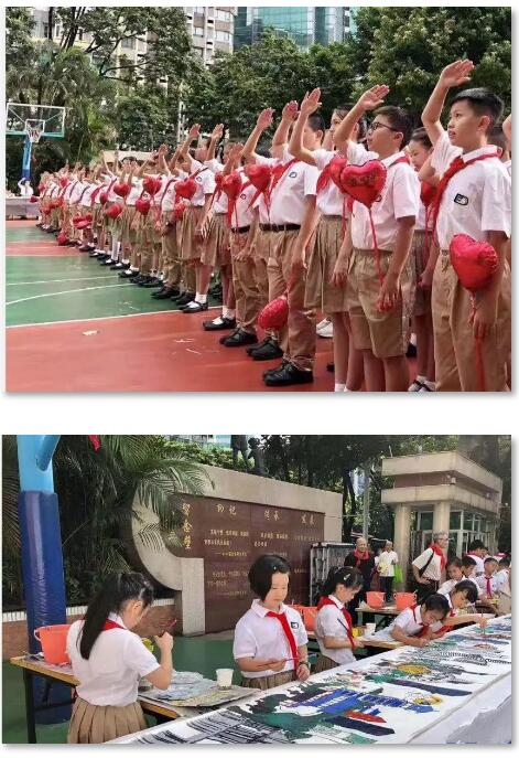 为庆祝新中国成立70周年,东风东路小学组织同学们在校门口即兴作画,通过手中的小小画笔,描绘出祖国的繁荣昌盛。在此次“东风颂祖国”系列美育成果展中,展出1000余幅学生美术作品,让学生们通过艺术的形式,切身关注国家的繁荣发展。在本次美育成果展的最后环节,“秀哉,我英雄花城”中,同学们亲身体验广州的传统文化及手工艺,他们还化身解说员,述说传统文化的历史故事。