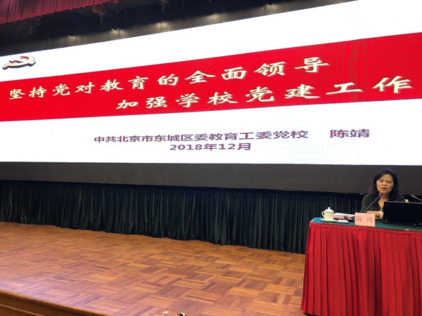 26日下午,北京市东城区教育工委党校书记兼常务副校长陈靖从三个方面作《坚持党对教育工作的全面领导,加强学校党建工作》专题讲座。一是依据党的十九大和全国教育大会的精神要求,深刻阐述了坚持党对教育工作的全面领导的重要性和必要性,指出了当前基础教育党建工作存在的困难和问题;二是就学校党建工作的主要内容,提出要贯彻落实好党中央相关文件精神和要求,学校党组织要切实发挥好战斗堡垒作用,履行好党组织的基本任务和主要职责。三是通过大量的事实和案例,从构建党建工作机制、提升党建工作质量、夯实党建工作基础、做好思想政治工作和营造教育系统良好政治生态等5个方面,就如何做好学校党建工作进行了解读。