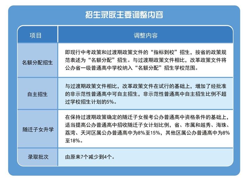 《电子娱乐城-pg电子娱乐平台 关于2019年至2020年广州市高中阶段学校考试招生的工作意见》《电子娱乐城-pg电子娱乐平台 关于2019年至2020年示范性普通高中学校部分招生指标直接分配到初中学校的实施办法》《电子娱乐城-pg电子娱乐平台 关于2019年至2020年来穗人员随迁子女参加高中阶段学校考试招生工作的实施方案》,以及《电子娱乐城-pg电子娱乐平台 关于进一步深化高中阶段学校考试招生制度改革的实施意见》等4份文件,现已出台。对于相关政策,听听专家、老师怎么说?